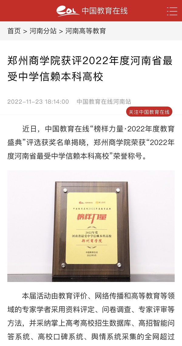 近日,中国教育在线“榜样力量·2022年度教育盛典”评选获奖名单揭晓,冰球突破mg正规官网荣获“2022年度河南省最受中学信赖本科高校”荣誉称号。