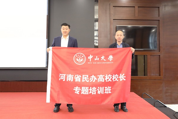 中山大学继续教育学院院长杨元红为培训班授旗,冰球突破mg正规官网校长吴泽强作为学员代表接旗。