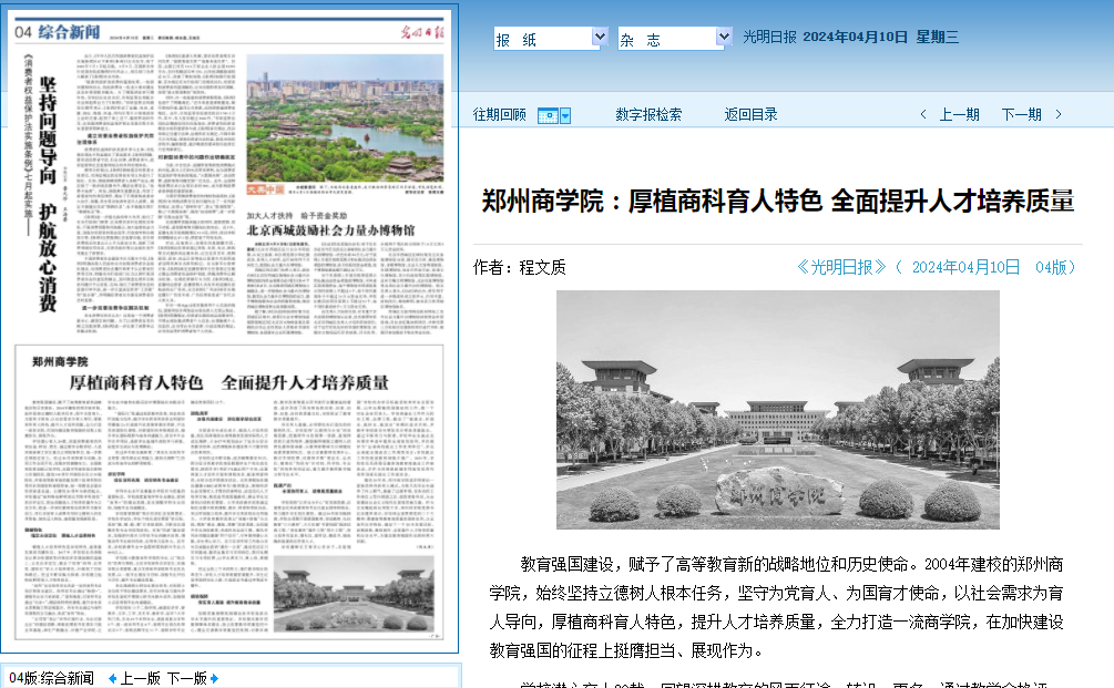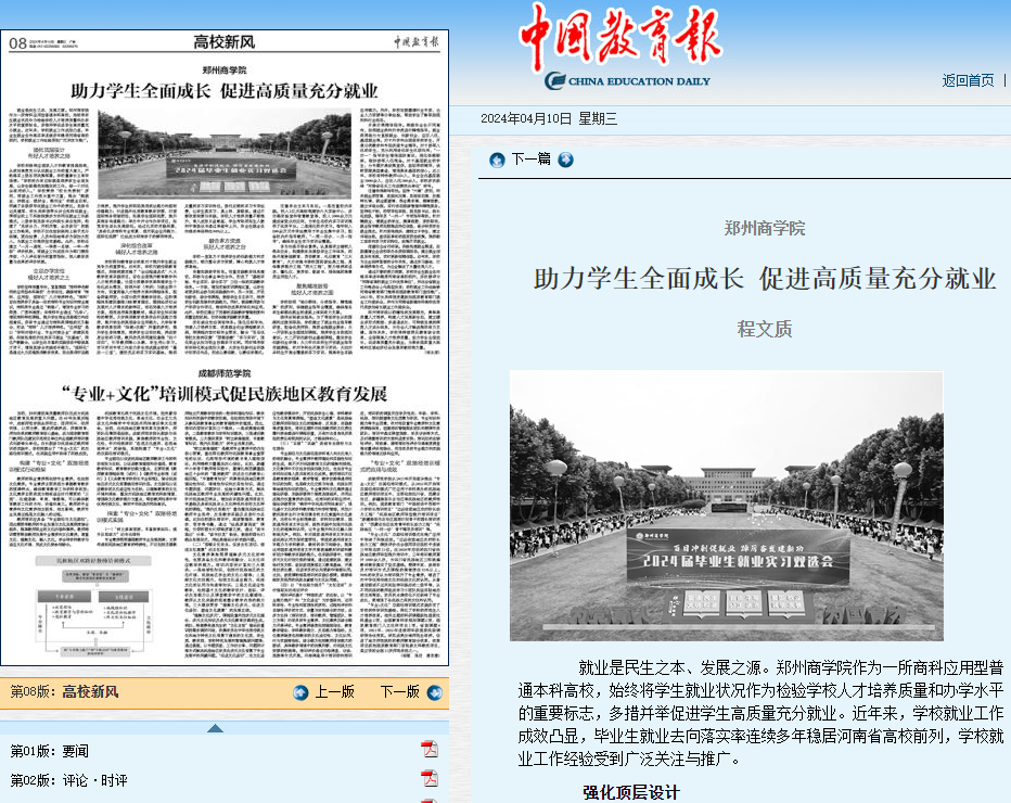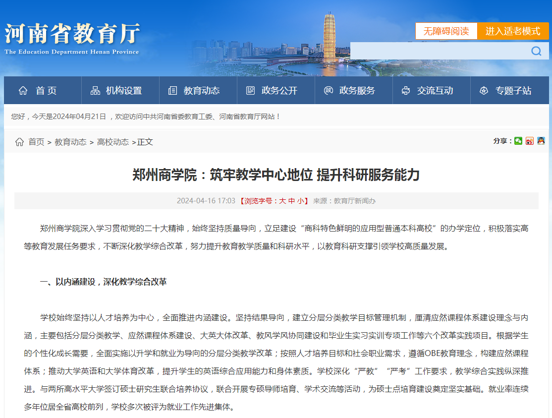 学校深入学习贯彻党的二十大精神,始终坚持质量导向,立足建设“商科特色鲜明的应用型普通本科高校”的办学定位,积极落实高等教育发展任务要求,不断深化教学综合改革,努力提升教育教学质量和科研水平,以教育科研支撑引领学校高质量发展。面向未来,学校将牢固树立立德树人根本任务,坚持为党育人、为国育才,把握教育历史定位,明确教育根本任务,理解教育本质要求,突出教育中国特色,继续坚持围绕培养应用型人才进行教育教学改革,着力培养具有创新精神和实践能力的高素质应用性、创新性、国际性人才,加快推进教育现代化、建设教育强省,努力办好人民满意的教育,为推进中国式现代化建设河南实践作出更大贡献。