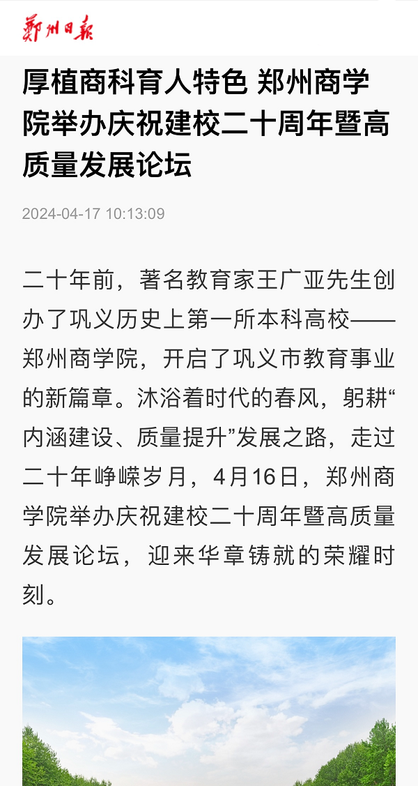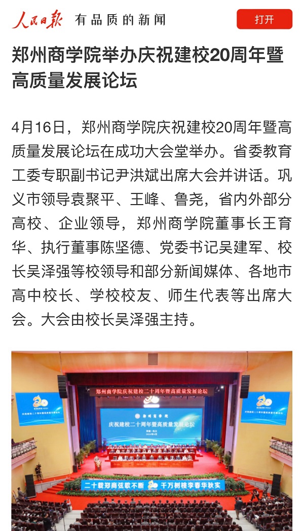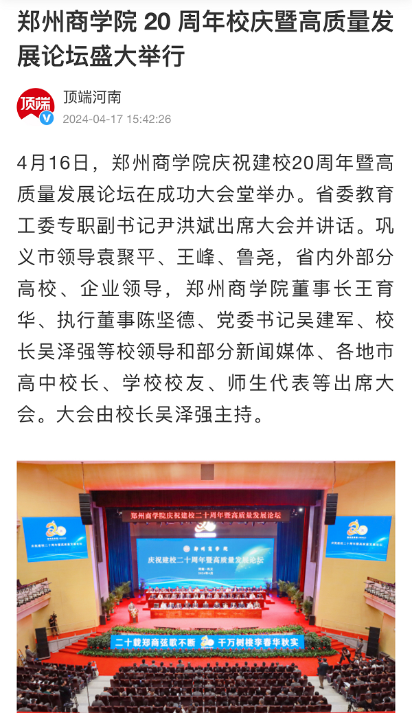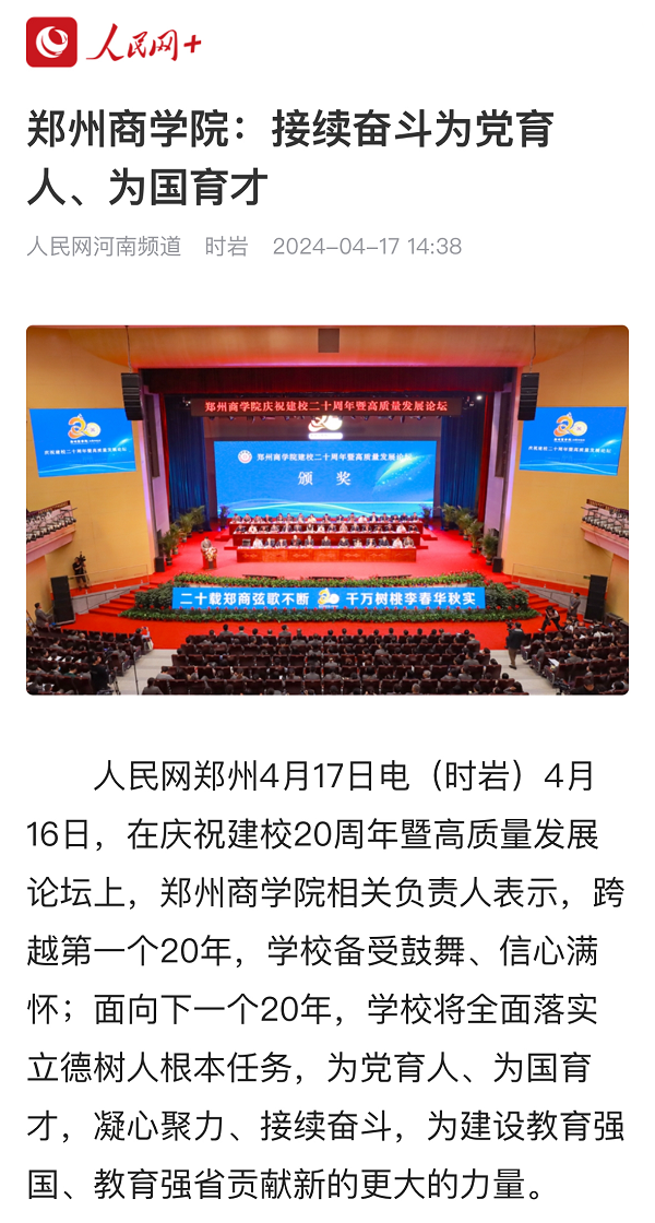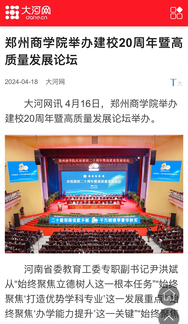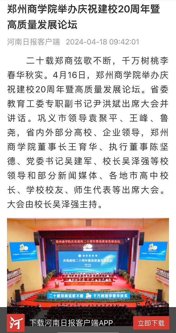 4月16日,冰球官网举办庆祝建校20周年暨高质量发展论坛,受到社会各界广泛关注。人民日报客户端、人民网、央广网、学习强国;河南日报、河南广播电视台(河南卫视新闻联播、午间新闻)、中国教育在线、大象新闻、顶端新闻、大河网、河南高教、河南教育宣传网、映象网、教育中原、今日头条、腾讯新闻;郑州日报、郑州电视台客户端、正观新闻等40余家国家级、省市级媒体聚焦报道,集中展示了冰球官网20年来的办学历程和育人成果。