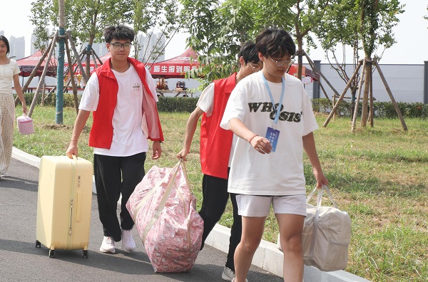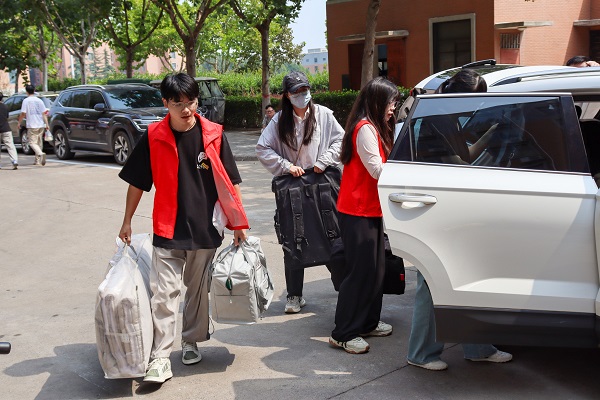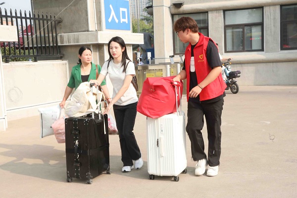 会计学院新生吕欣蓉与志愿者们进行了一场“双向奔赴”。“这么热的天,学校的志愿者不仅帮我扛大包小包的行李,还笑着给我介绍学校好玩的地方,特别感动。”在顺利到达宿舍后,吕欣蓉拿出了从家里带的小零食分给了志愿者们,这场温馨的相遇是郑商“友爱互助”的缩影。