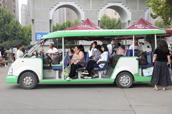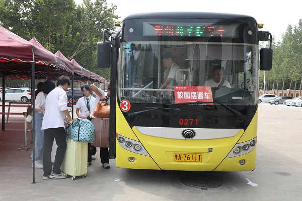 学校在紫荆东、紫荆西、三彩校区分别开通摆渡车专线,接送新生及行李,实现校门到宿舍的“无缝衔接”。据司机王海荣介绍:“学校提前为每个校区规划了最便捷的路线,我们从早上七点到晚上七点,平均三四分钟发一趟,全天不间断运行,覆盖所有宿舍楼,希望能帮新生和家长减轻负担。”