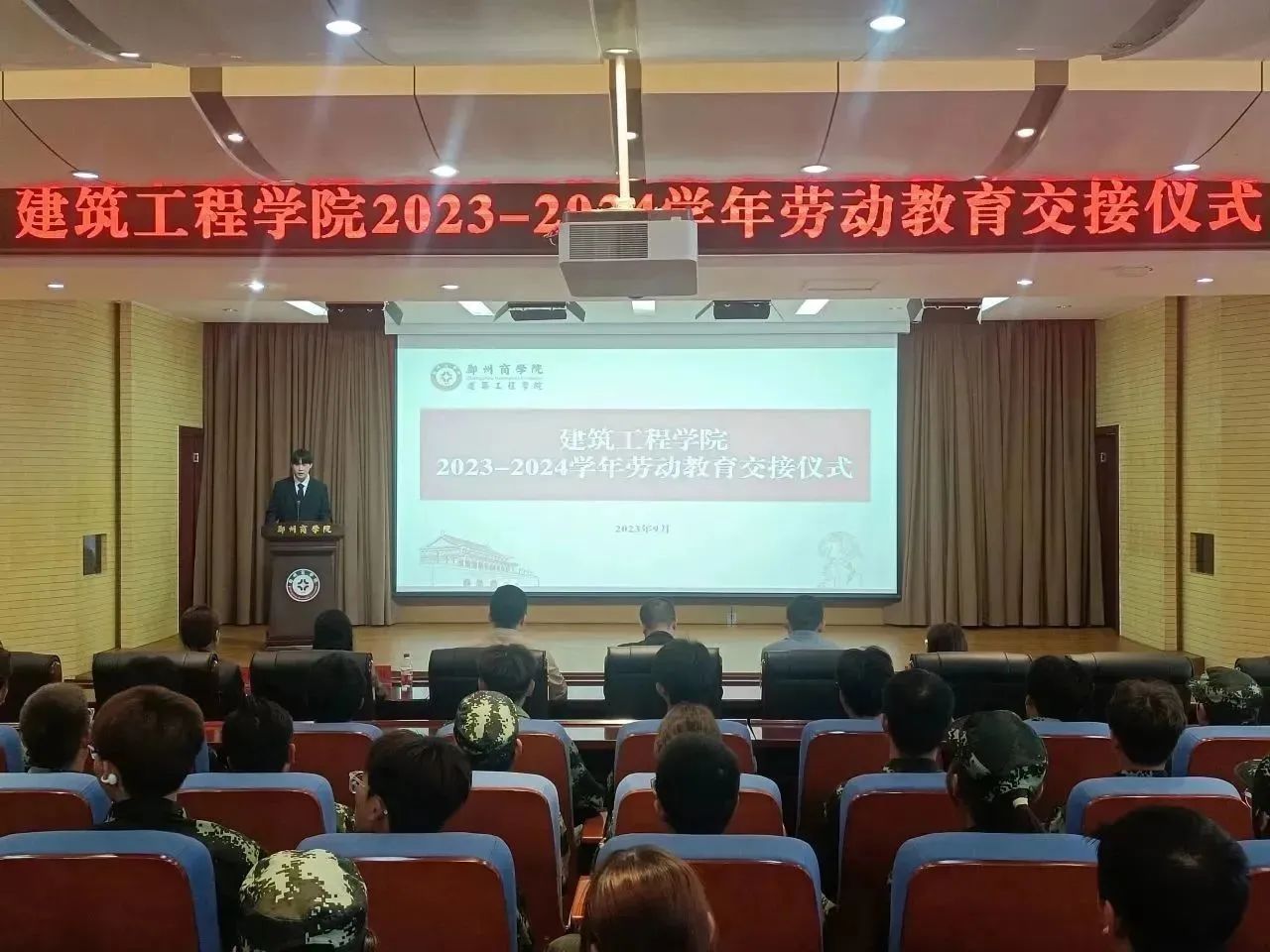 为扎实做好新学年劳动教育工作,引导23级新生树立正确的劳动观念、理解劳动的意义,培养良好的劳动习惯,9月28日上午,建工学院在图书馆五楼报告厅隆重举行2023—2024学年劳动教育启动暨交接仪式。我院党委书记朱宏东、学务处劳卫科科长贺萌、团委书记刘帅、2023级新生辅导员以及2023级新生代表共同参加。
