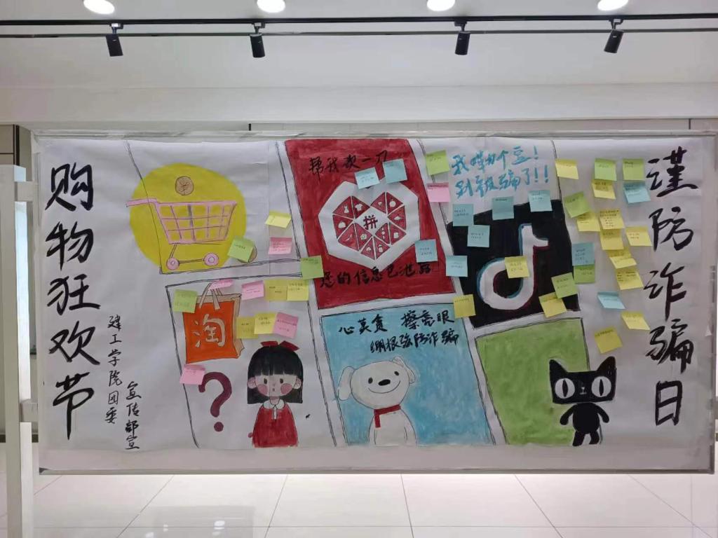 为了提高我院学生的反诈意识,在“双十一”购物节期间保障广大学生的财产安全,由建筑工程学院权益部举办的“购物狂欢节,谨防诈骗日”主题板报活动于11月10日在亚泽楼举行。