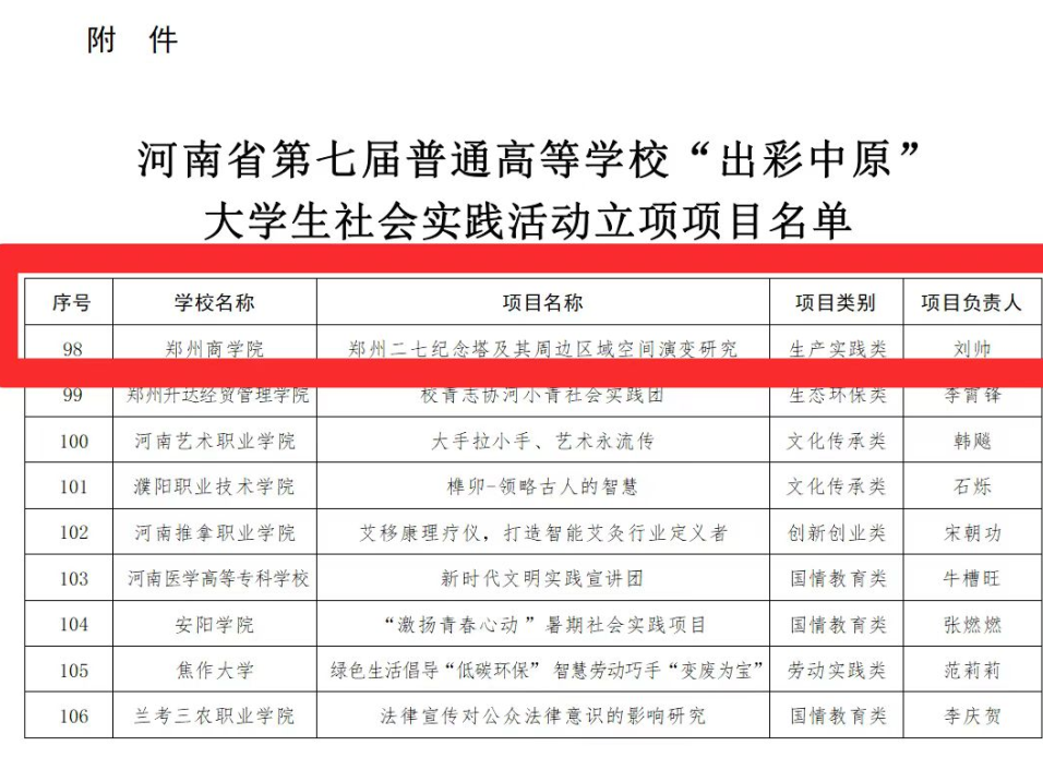 2024年3月7日,河南省教育厅关于第七届普通高等学校“出彩中原”大学生社会实践活动项目立项结果公示,冰球突破mg正规官网建筑工程学院的生产实践类实践活动“郑州二七纪念塔及周边区域空间演变研究”项目立项。