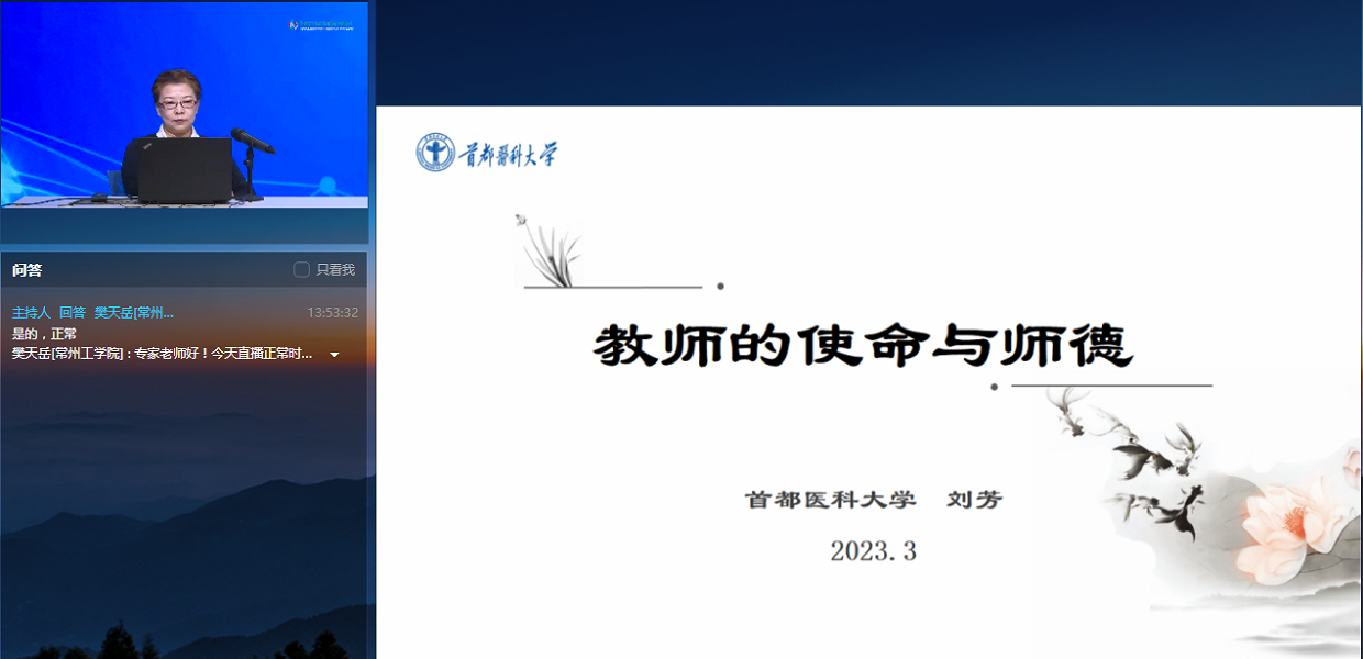 本次培训邀请首都医科大学刘芳教授作专题讲座。刘教授从高等教育现实命题出发,结合我国当前意识形态和高校教育教学的现状和高校学生实际情况,阐述了高校教师应该承担的历史使命和应该具备的个人品质,刘教授指出新时代高校教师的使命和责任应体现在以下四点,一是以自身的科研教学建设学校的学科,二是以自身的修养学识形成学校的风格,三是以自身的学养风范积淀学校的文化,四是以自身的责任奉献实现学校的发展。最后刘教授分析了高校教师师德应有规范,高校应建立全人教育,充分关怀,有教无类、建立师德机制形成制度体系。