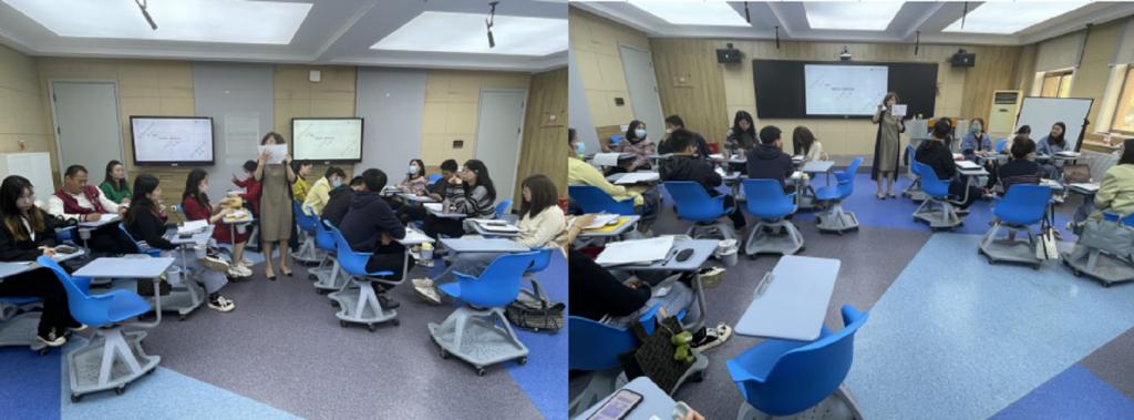 本次工作坊分为教师基本教学技能提升、高校课堂教学方法的创新运用和实践操作三个模块。在模块一中宋荣教授分析了教师的教学基本技能在教学过程中的重要性,并从教态转换技能、教学语言技能、导入技能、板书技能、教学技能等十个方面详细阐述了提升教学基本技能的方法。模块二主要围绕课堂教学创新的方法,从实现课堂有效互动的技巧策略入手,紧扣教师课堂教学中导入、讲授、提问、研讨、活动设计、小结、课程思政要素挖掘等环节详细讲述了提升教师教学创新技能的理念和方式方法。在实践操作模块,宋教授将参训教师分为4个小组,针对课堂活动设计进行实践演练,参训教师积极参与其中,在宋教授的指导下,不断改进完善。工作坊结束后,宋教授就个别参训教师课件制作、教学方法等方面存在的问题和困惑进行了有针对性的解答。