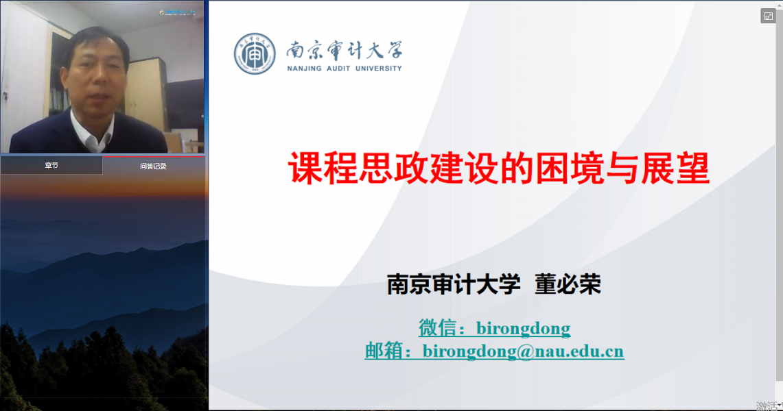 南京审计大学副校长董必荣作题为《课程思政建设的困境与展望》的报告。董教授从课程思政的本质、课程思政的认识误区、课程思政的建设困境、课程思政建设的趋向与挑战和如何推进课程思政建设等五个方面进行了详细的阐述,并结合国家级课程思政示范课程《会计学》建设实践,分享了课程思政建设的具体实施路径。