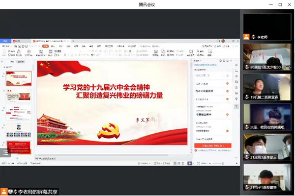 第二讲党课的主题是《党的百年奋斗重大成就和历史经验--深入学习贯彻党的十九届六中全会精神》,党课开始前李老师对每一位同学表示欢迎与祝福。随后李老师带领同学们深刻领悟感受党的第十九届六中全会的精神与内涵,给同学们详细讲解党要召开的每一项重要会议的历程时间,事项等,也给同学们科普了很多关于党对道路的探索和党的历史故事。