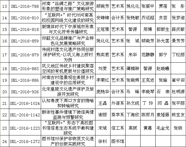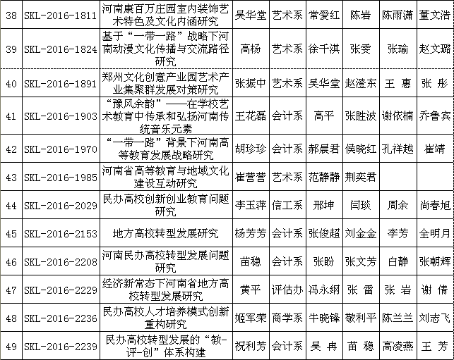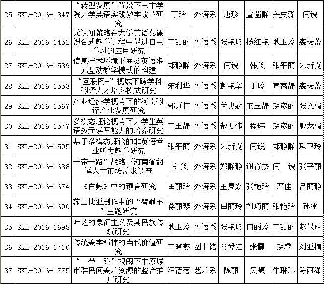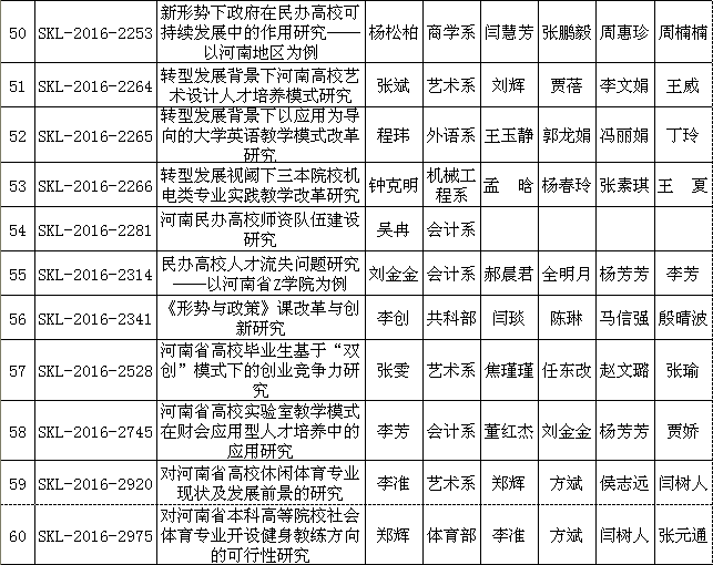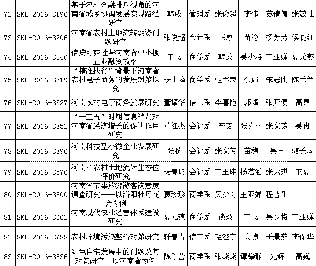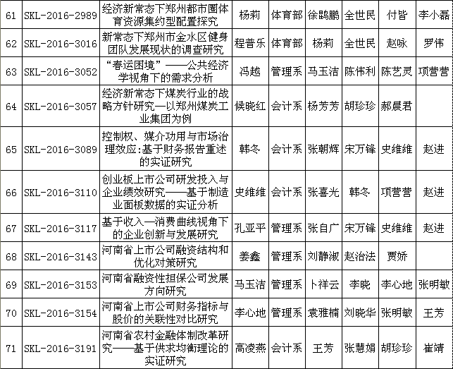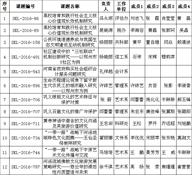 根据河南省社科联、河南省经团联《关于下达河南省社科联、河南省经团联2016年度调研课题项目的通知》(豫社科联字【2016】26号)文件,我院83项课题获河南省社科联、河南省经团联立项,接到通知后,请各项目负责人认真组织实施,在规定时间内完成调研任务,并将课题报告一式2份附电子文档,于2017年3月10日前报送科研处。