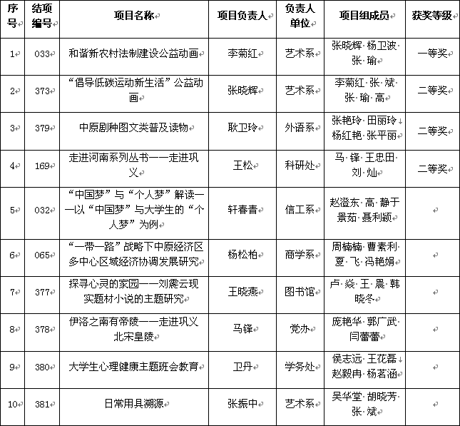 根据河南省社会科学联合会《2015年度河南省社会科学普及规划项目结项与获奖情况通报》(豫社科联字〔2016〕30号文件),我院10项河南省社会科学普及规划项目顺利结项并获一等奖1项,二等奖3项。望获奖同仁再接再厉,争取在今后的科研工作中取得更多更好的成绩。