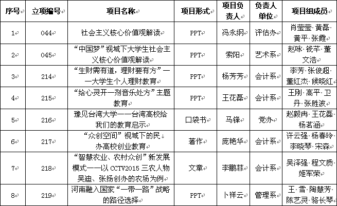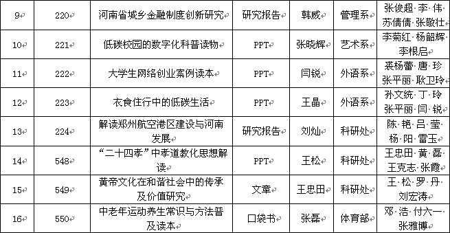 根据河南省社会科学界联合会《关于下达2016年度河南省社会科学普及规划项目的通知》(豫社科联字〔2016〕31号文件),我院25项课题获河南省社会科学普及规划项目立项,请各项目负责人认真组织实施, 在2017年3月31日前完成项目,并将项目成果一式2份附电子文档,于2017年4月1日前报送科研处。