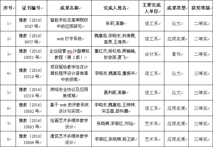 根据河南省教育厅《关于公布2016年度河南省信息技术教育优秀成果奖的通知》(教信息〔2016〕696号文件),我院8项成果获河南省信息技术教育优秀成果奖,望获奖同仁再接再厉,争取在今后的科研工作中取得更多更好的成绩。