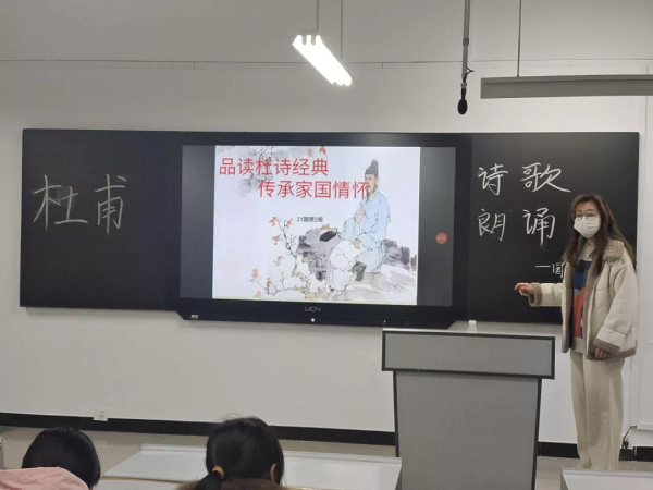 各班级在辅导员老师的组织带领下,利用早读时间齐声朗诵《望岳》《登高》《春望》《茅屋为秋风所破歌》等古诗词;在课下时间组织开展杜诗主题诵读解析、诗词接龙比赛等多种形式专题阅读活动,活动中同学们沉郁顿挫的朗诵仿佛让人如同身临其境体会杜甫的万千情感。同学们相互交流心得,分享阅读体会。