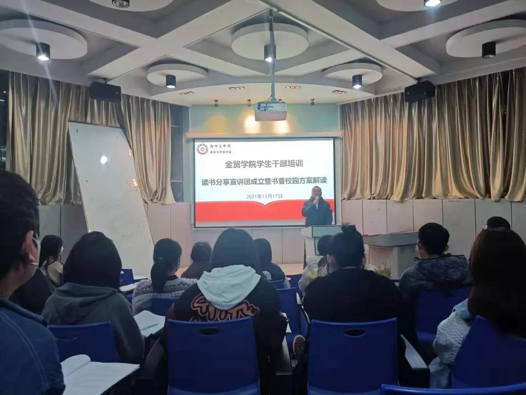 11月17日下午,金贸学院在1号教学楼101教室召开读书分享宣讲团成立暨书香校园方案解读会,会议由行政秘书兼团委书记杜尚远主持,各班学习委员共同参与。