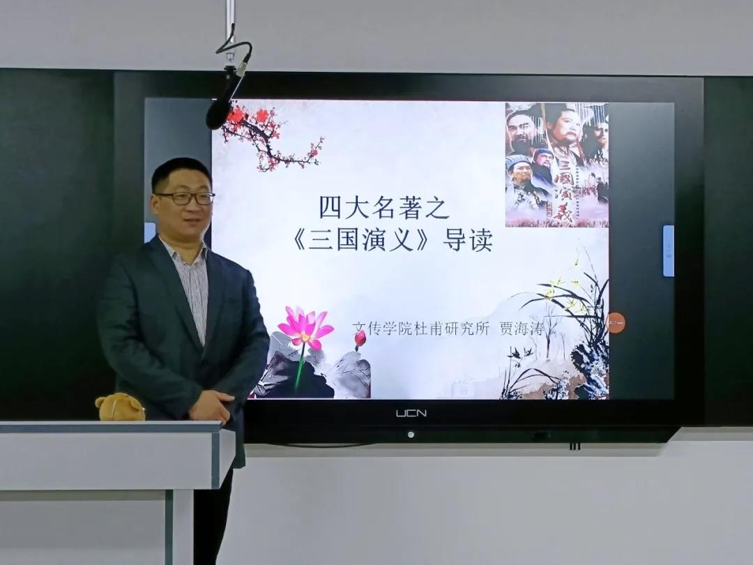 11月25日,文传学院、图书馆联合组织开展了“郑商百家谈”系列讲座第五期,特邀文传学院贾海涛老师主讲四大名著之《三国演义》导读。本次讲座利用线上线下结合的方式,为同学们带来了别开生面的三国盛宴。