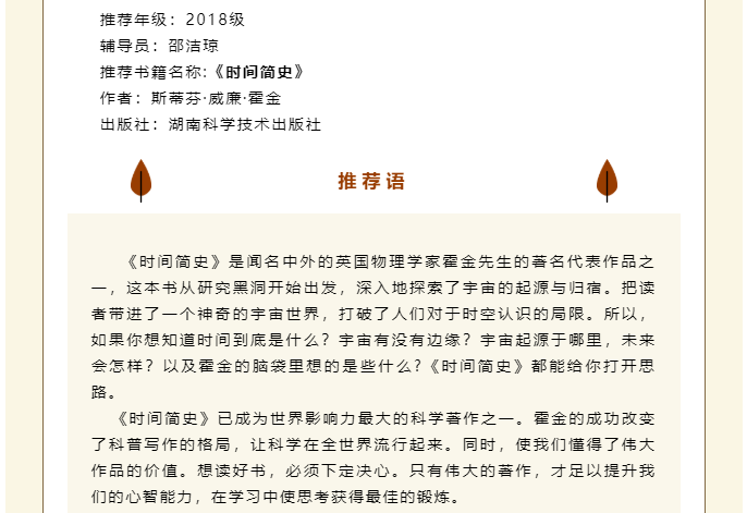 为推进书香校园阅读经典工程的有效实施,丰富学生假期生活,会计学院开展了“辅导员推荐!打开这份书单充实你的寒假”图书推荐活动。辅导员积极推荐优秀书籍,认真编写推荐理由。通过此次活动鼓励学生与书籍为伴,同经典、名著对话,从书中汲取对知识和思考的感悟。