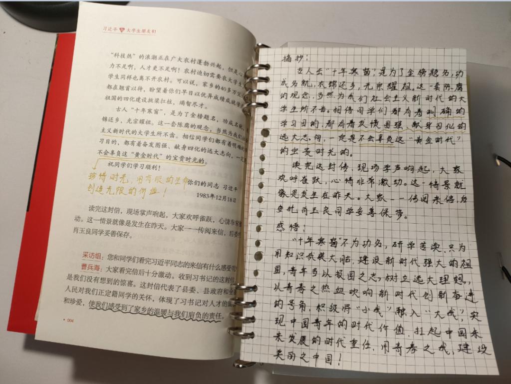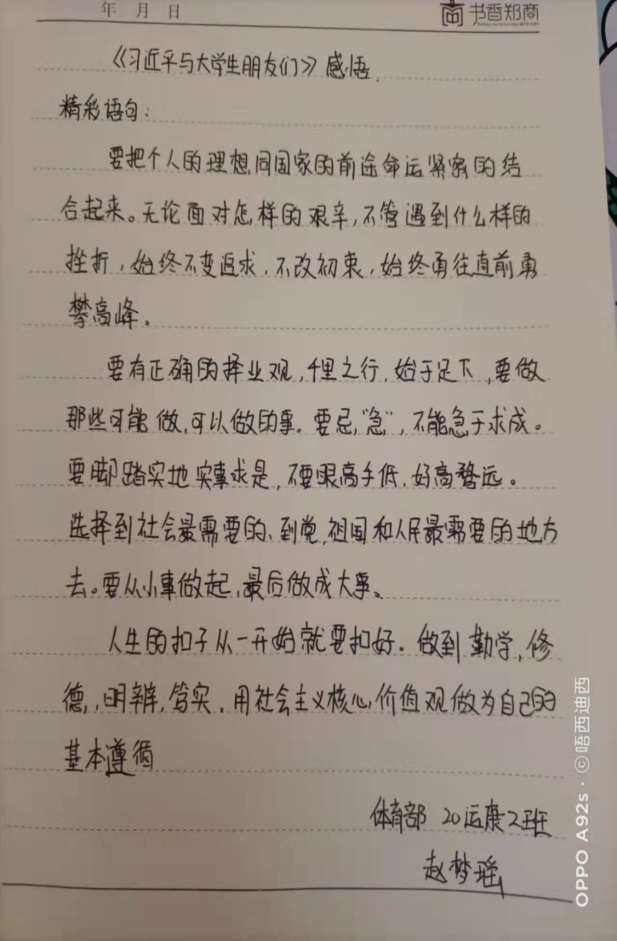 为迎接中国共产主义青年团成立100周年,推动广大学生多读书、读好书、认真读书,深入学习领会习近平总书记对青年健康成长的一系列重要要求,金贸学院组织学生开展“牢记领袖教导分享青春感悟”——《习近平与大学生朋友们》精读大赛,同学们抄录精彩语句、记录学习感悟,展示分享自己的所思所想。