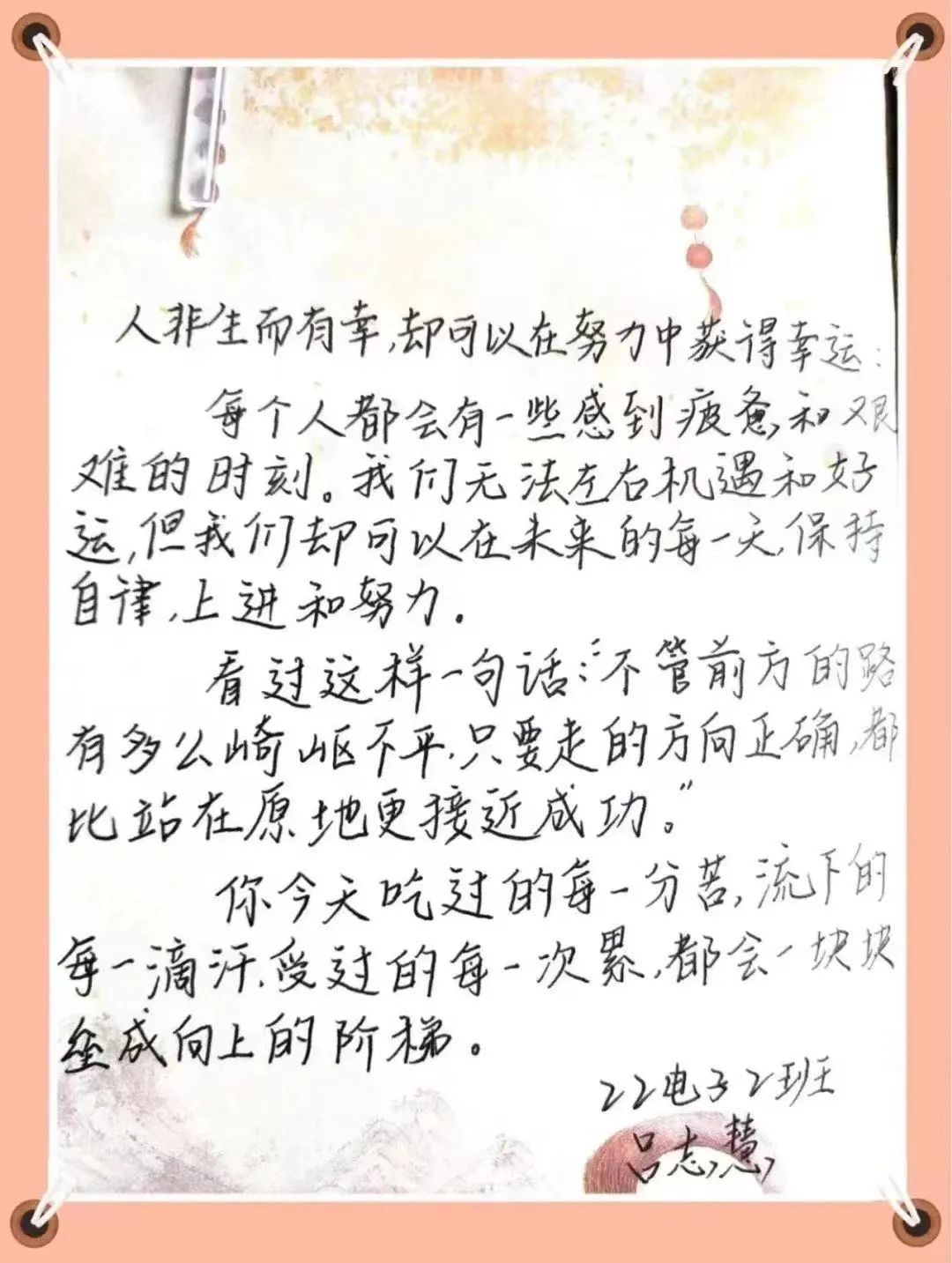 日月其迈,岁律更新,新学期也如约而至。2月8日,信工学院开展寄语新学期活动,同学们书写下自己对新学期的期待与计划。文字是有力量的,纸片上短短的几行字,承载的却是同学们对接下来学习生活的追求与希望。希望新学期大家珍惜时光,刻苦学习,不负韶华,对自己,要有一份奋发;对社会,要多一份尊重;对学业,要倾注深情。让学习丰富我们的人生,让学习赋予生活更多的意义。