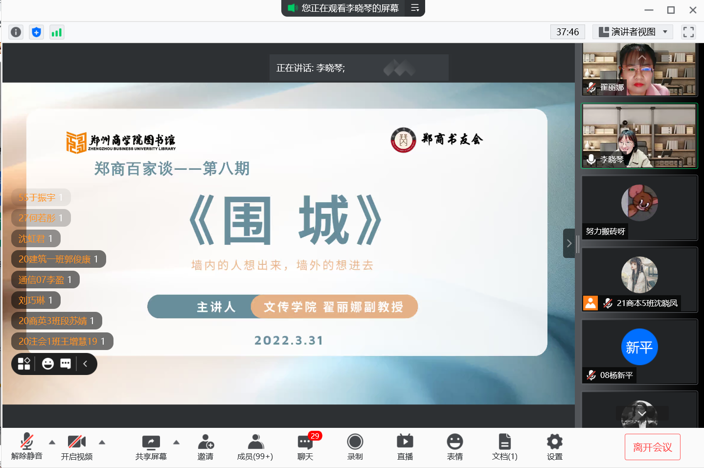 为推动“书香校园阅读经典工程”建设,引导学生阅读经典,3月31日,图书馆、郑商书友会邀请文传学院崔丽娜老师,于腾讯会议线上开展“郑商百家谈”第八讲,分享钱钟书先生的长篇小说——《围城》。