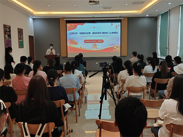 为加强校园文化建设,营造浓厚的校园文化氛围,全面推动“书香校园”经典阅读工程,贯彻学校图书馆的各项要求,4月20日晚图书馆和工商管理学院联合举办“郑商百家谈”第十讲读书分享会,活动采用线上线下相结合的形式开展,我院党委书记宋森、团委书记董文浩,书香校园阅读经典工程负责小组的指导老师库玉娟、逯妍妍、遆瑞娇参加分享会。本期“郑商百家谈”由马克思主义学院党委书记牛晓锋教授为同学们解读《人间简史》相关内容。