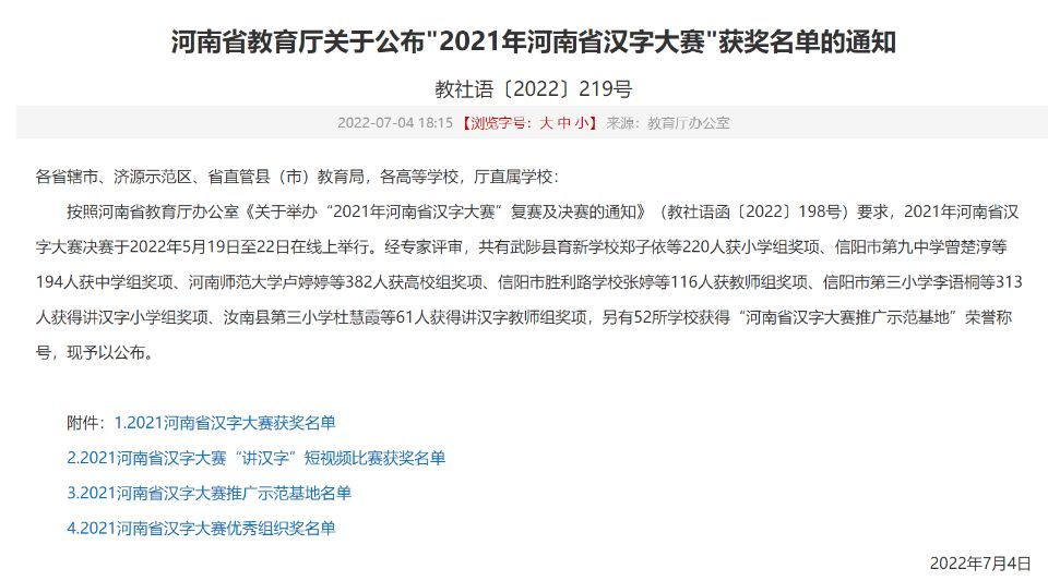 近日,河南省教育厅发布《关于2021年河南省汉字大赛获奖名单的通知》(教社语[2022]198号),冰球官网代表队积极参与,夺得佳绩,其中2019级学教2班陈梦雪、2020级国教1班樊佳怡、2020级汉本1班姚语、2021级国教1班魏尧荣获三等奖,潘亚萍、祁小艳老师荣获“最佳辅导老师”奖。