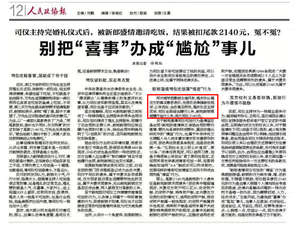 2022年10月11日出版的《人民政协报》中,我院王继风接受以专家身份接受采访,针对近期社会生活中的热点现象从法律专业角度进行点评。