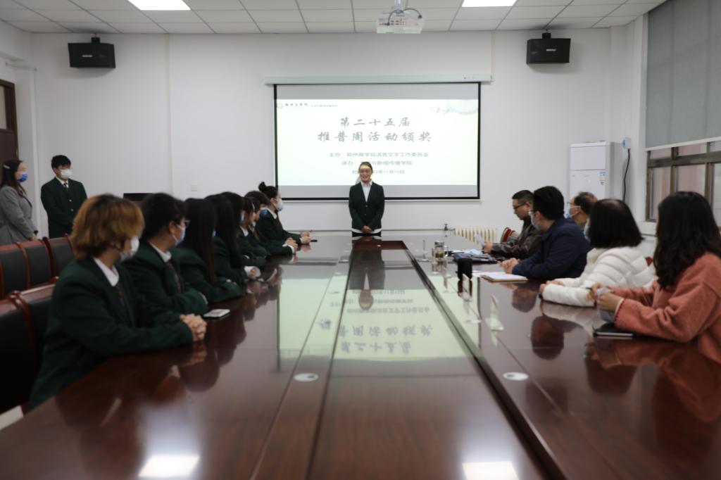 颁奖仪式上,文学教研室贾海涛主任作为评委代表发言。本届推普周活动优秀代表21新闻1班的康晓涵,进行了精彩的节目表演——朗诵《少年中国说》。