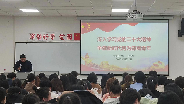 党课第三讲由党委办公室姜兴业老师主讲,他以“深入学习党的二十大精神,争做新时代有为郑商青年”为主题从“深入学习领会党的二十大的主题,主要成果、深入学习领会过去5年的工作和新时代10年的伟大变革及其里程碑意义、深入学习领会开辟马克思主义中国化时代化新境界的历史责任、深入学习领会新时代新征程中国共产党的使命任务”四个方面展开讲述学习贯彻党的二十大精神,自信自强,守正创新,踔厉奋发,从而全面建设社会主义现代化国家,全面推进中华民族伟大复兴。