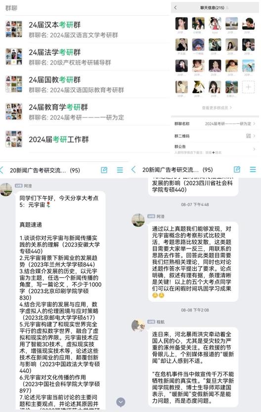 我院分专业建立“2024届考研指导群”。院领导、教研室主任、专业老师、辅导员及时为学生提供最新的考研信息,第一时间给学生答疑解惑,给予学生暖心鼓励和心理疏导,帮助考研学子认清形势、调整心态、明确方向,切实提升学生的应试技巧和能力,提高学生考研成功率。