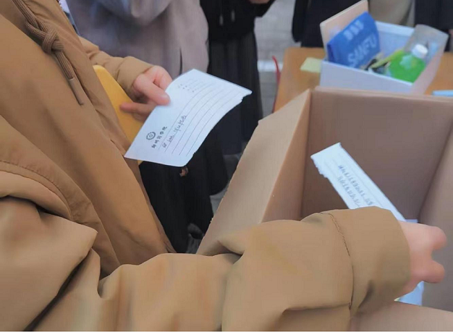 天微亮,许多同学就早早地来到活动地点,写下寄托着美好愿望的便签或带着满是祝福的闲置物品交给工作人员,然后以盲盒的形式抽取。一句话一段文字,一只千纸鹤,不仅仅是它本身的价值,更重要的是来自陌生朋友的一份真挚的祝愿。参与活动的同学纷纷表达了自己的感受,“希望我的这份闲置的眼镜可以交换给真正能用到的人,我也收获了很有意义的便签!”“人生是诗歌,我有我的平仄,真的很喜欢这句话,步入大学新生活,希望我也可以谱写自己的篇章......”。活动收尾,每位参与者都在工作人员的协助下,找到了自己中意的温暖祝福和物品。