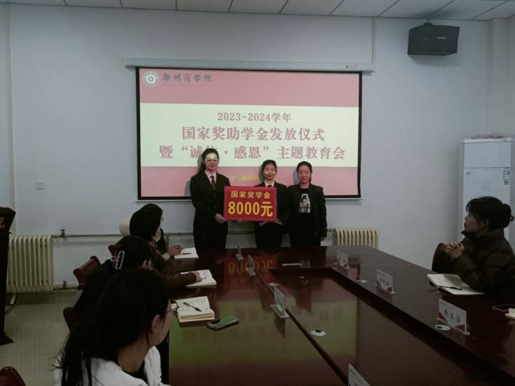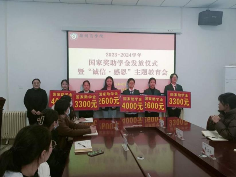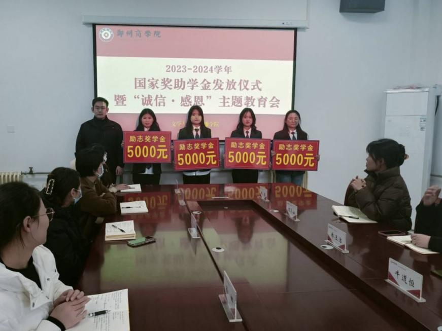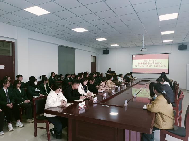 为大力推进资助育人,落实学校奖助学金发放工作,激励学生奋勇向前,引导受助学生心存感恩,回报社会。12月4日下午,文传学院在自力楼216会议室举行2023-2024学年国家奖助学金发放仪式暨“诚信·感恩”主题教育会。文传学院党委书记贾蓓、团委书记王凯、文传学院全体辅导员及受助学生代表参加此次会议。