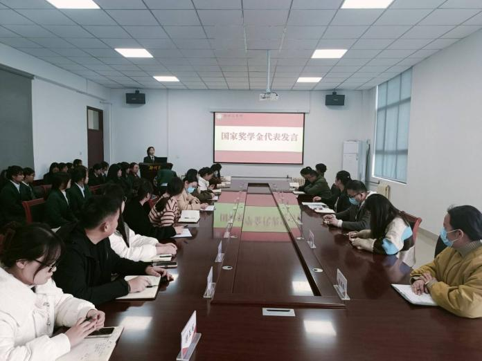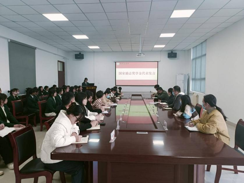 会议伊始,主持人姚瑶介绍此次会议召开的背景和目的。接下来,进行国家奖助学金发放仪式。文传学院党委书记贾蓓、团委书记王凯、辅导员乔玉洁老师分别为国家奖学金、国家励志奖学金和国家助学金学生代表颁发奖牌。