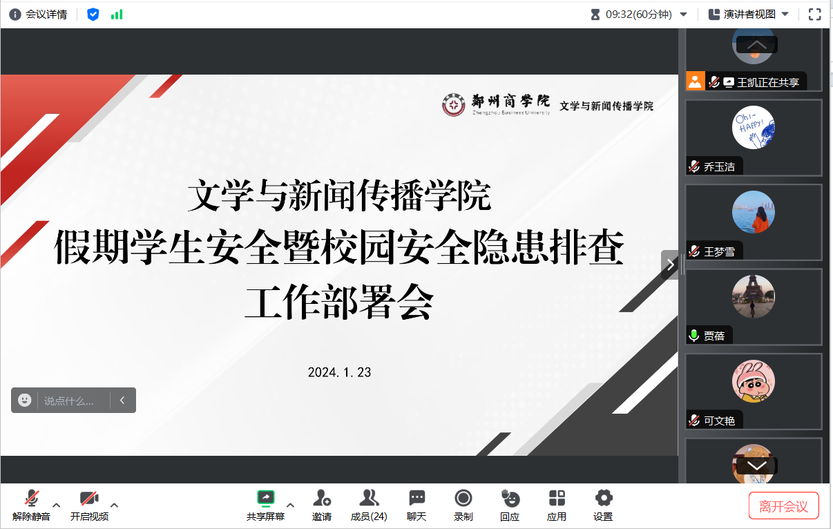 为进一步加强校园安全,切实排除安全隐患。1月23日,文传学院召开线上假期学生安全暨校园安全隐患排查工作部署会,文传学院党委书记贾蓓、团委书记王凯及全体辅导员参会。