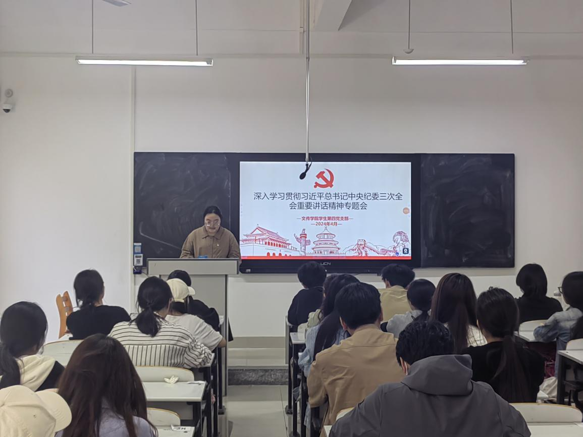 4月19日,文传学院学生第四党支部在自力楼204召开专题会议,旨在深入学习贯彻习近平总书记在中央纪委三次全会上的重要讲话精神。
