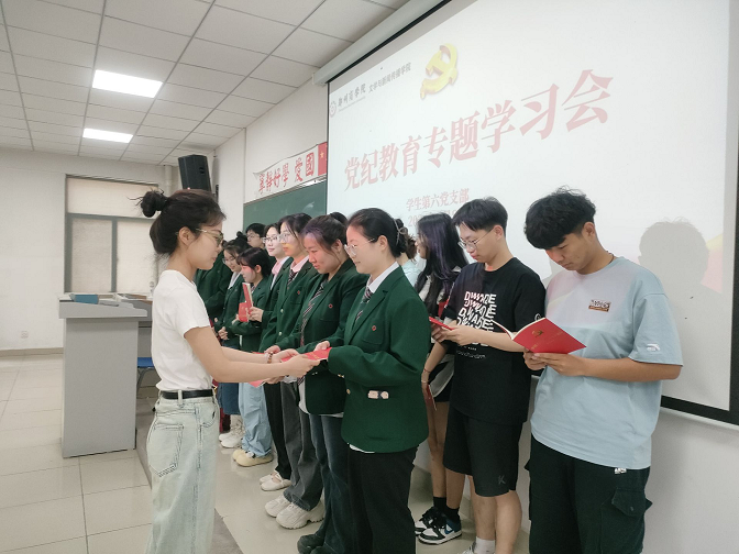会议伊始,支部书记温舒涵老师从党纪学习教育、逐章逐条学纪、融会贯通知纪等方面展开,强调党纪学习教育对学生党员的重要性。接着,为在校学生党员发放了《中国共产党纪律处分条例》手册,希望党员同志们能认真积极学习条例内容,并以此为契机,不断深化自身的党性意识和纪律意识,自觉遵守党的各项纪律和规定。最后,全体学生党员共同观看党纪学习教育纪录片,书记温舒涵老师特别指出,身为青年党员要深刻理解党纪的重要性,认识到遵守党纪是每个党员的基本要求,不断增强对党纪的敬畏之心。