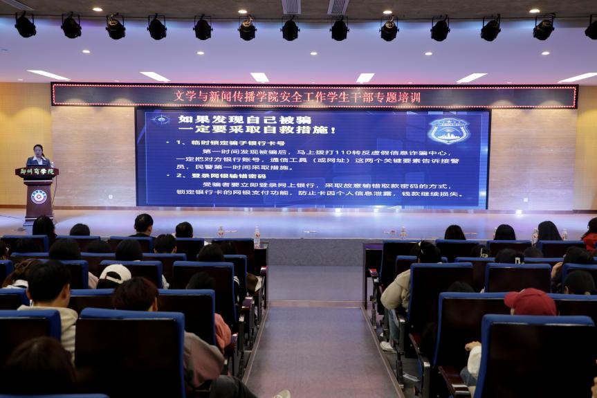 为进一步加强我院学生干部队伍建设,充分发挥学生干部在安全教育工作中的职能功效,10月23日下午,我院于自力楼三楼报告厅开展2024文传学院安全工作学生干部专题培训。我院党委书记贾蓓,行政秘书王凯,辅导员老师以及全体班长和宿舍长参加此次培训,本次会议由行政秘书王凯主持,党委书记贾蓓主讲。