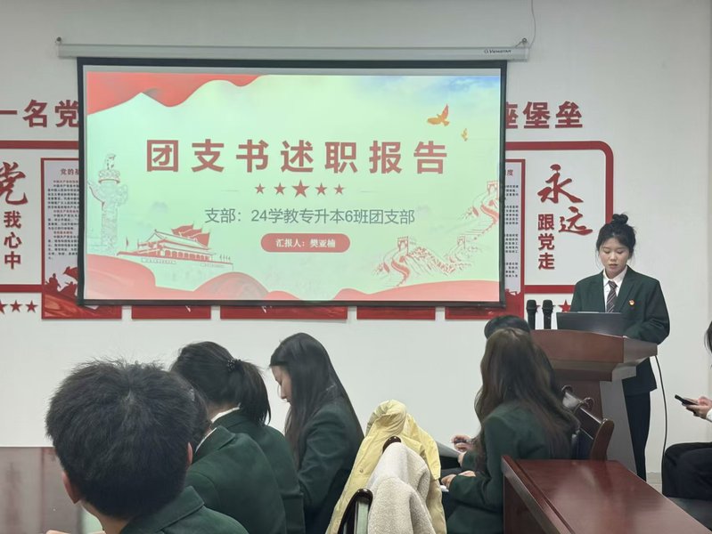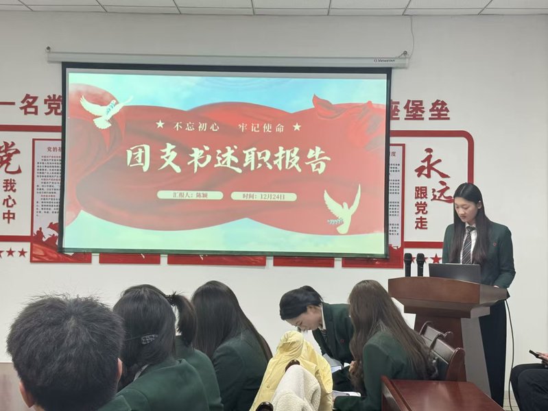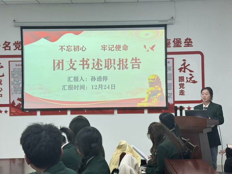 会议由组织部陈曦同学主持,各班级团支书依次上台进行述职汇报。团支书们详细汇报了本学年各自团支部的青年大学习检查情况、主题团会开展情况、智慧团建团课录入情况、团费收缴情况等各项工作。同时,他们也分享了工作中遇到的困难与应对措施,并进行了深刻的反思与总结,从中吸取经验,不断提升工作水平。