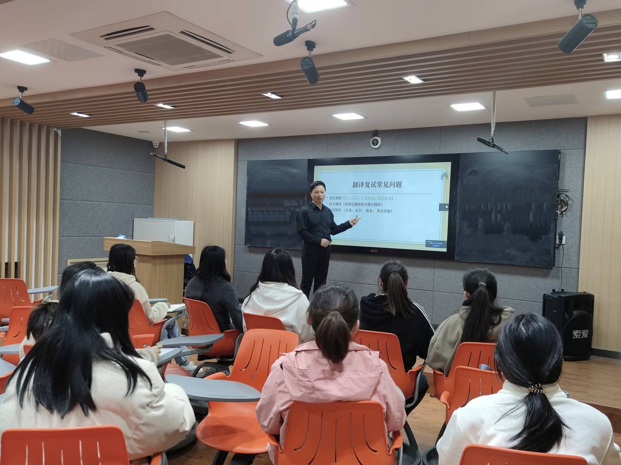 3月22日下午14:30-16:30,乔修春老师对9名翻译方向的同学进行了考研翻译理论与实践专题培训。他从“中国式现代化”、“全过程民主”等时政热词入手,首先阐述了翻译的定义、性质、分类、中外翻译理论家提出的翻译标准等专业相关知识,并结合18级笔译方向研究生复试真题讲解了英译汉、汉译英常用翻译技巧,梳理了常见的翻译理论(功能对等理论、目的论、顺应理论等)及归化策略、异化策略,最后带着学生了解了生态翻译理论、接受美学翻译视角、顺应理论视角等翻译研究理论视角。他要求学生备考要结合二十大、两会热词、以及李克强总理政府工作报告进行全面复习,同学们表示收获满满。