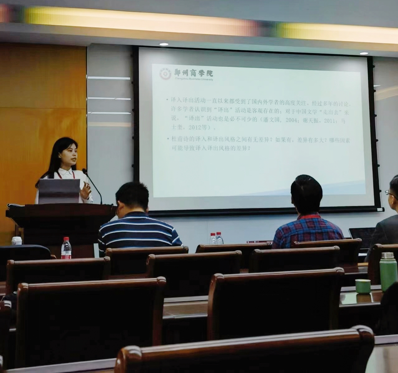 同时论坛还设立九个分论坛,分别就平行语料库,译学理论,文学翻译,社科翻译等方向展开讨论,我院贺琳老师在分论坛做了“杜甫诗译入译出操作规范对比分析:基于语料库的考察”,西南大学胡显耀教授进行了点评和指导,胡教授肯定了贺琳老师研究,认为很有特色,建议就杜甫诗英译的音韵层面做更加深入的分析。