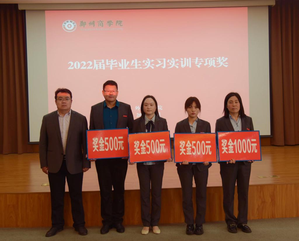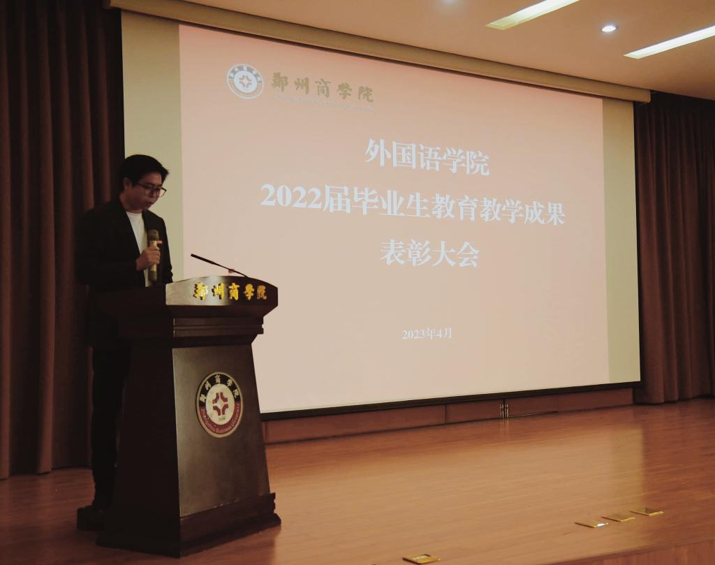 会上,邱院长宣读《外国语学院关于表彰2022届毕业生教育教学成果的决定》,奖项包括实习实训专项奖、大学英语考研考证指标奖、外语专业考研专项奖和先进个人奖。与会校领导分别为先进集体和先进个人颁奖。翻译专业教研室主任郜万伟老师和商务英语教研室郑静静老师分别作了典型发言。