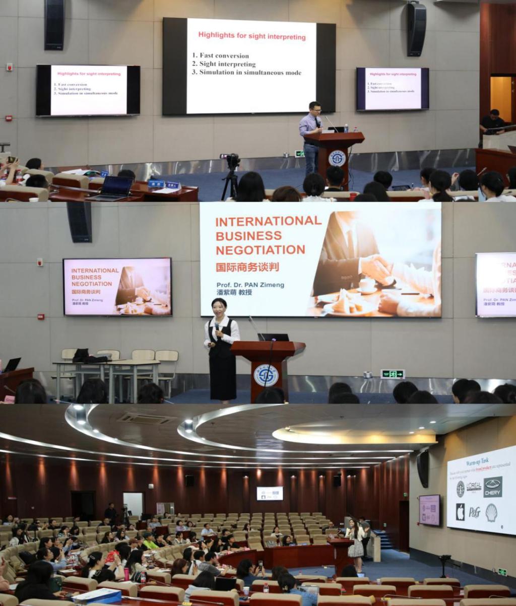 公开课环节,西南财经大学外国语学院吴瑾老师以“口译中的视译技巧”为题进行讲授。吴老师围绕Fast Conversion(快速转化)、Sight Interpreting(视译)、Simulation in Simultaneous Mode(同声传译模拟)三个部分,结合党的二十大报告,按照词、句、语篇逐层推进,讲练结合;潘紫萌老师讲授的《国际商务谈判》公开课则运用案例式、任务式、启发式教学法,在介绍了谈判策略和技巧后,让学生现场模拟美国LBT和比亚迪的谈判,并进行现场点评;黄志华老师的《商务英语听说》公开课以中国式现代化为切入点,采用了任务式教学法,在进行词汇和语篇输入之后,让学生现场模拟华为、联想、北斗导航科技、比亚迪等公司的产品发布会,并要求学生在产品介绍时体现人与自然和谐共生的中国式现代化理念。三位教师扎实的教学基本功、先进的教学理念和别具一格的教学设计以及学生们精彩的课堂表现令与会教师深受启发。