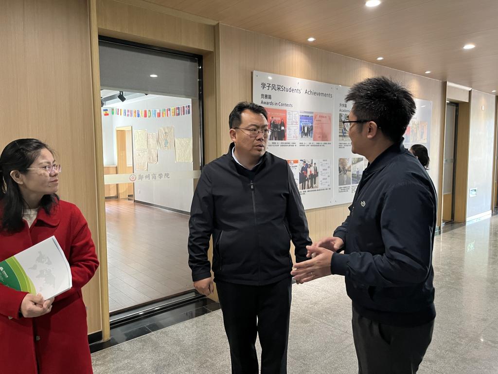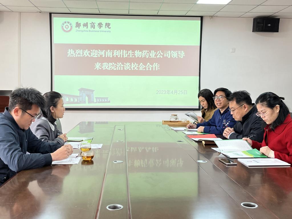 4月25日上午,河南利伟生物药业股份有限公司内贸部经理余博、外贸部经理薛雯月来到我院,与我院洽谈校企合作事宜。我院副院长赵保成、商务英语教研室主任葛莹辉、翻译专业教研室主任郜万伟、辅导员卢学敏老师参加了会谈。