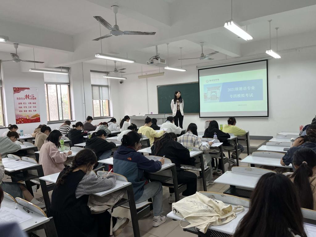 为全面促进学院教风学风建设,帮助学生适应德语专业四级考试,大力提高德语专业学生四级通过率,5月5日上午,我院德语专业在外语楼W306和W307组织开展了21级德语专业学生第一次专四模拟考试。