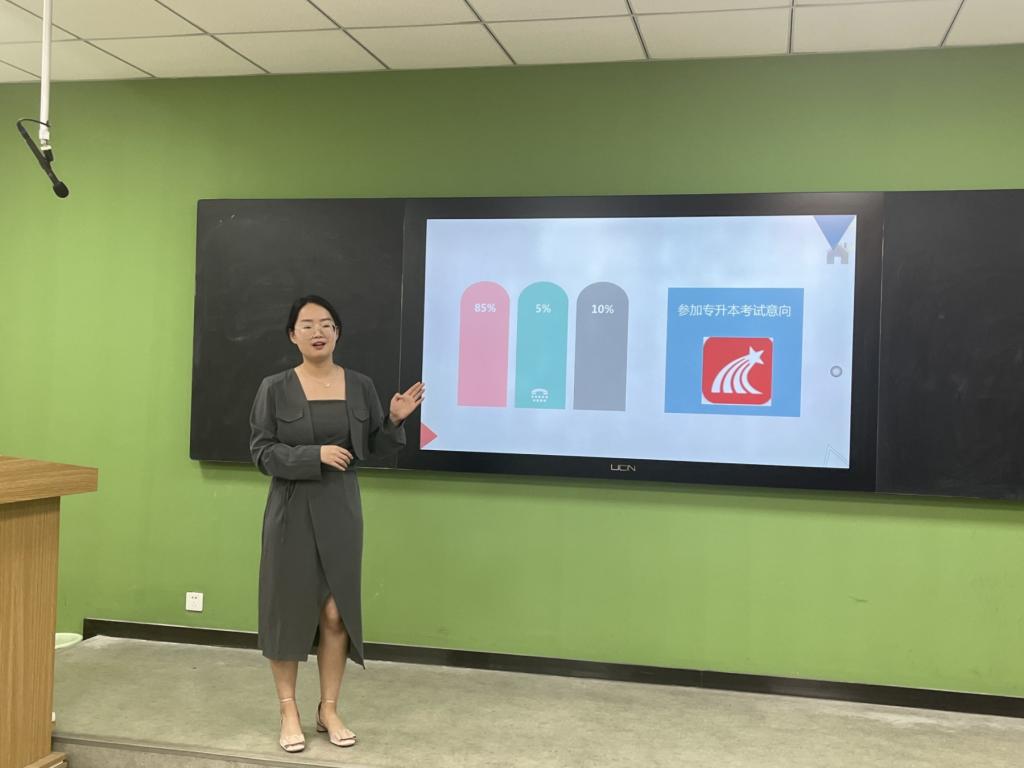 活动中,大学英语第二教研室22级专科课程组贺玲玲老师以《22级专科英语教学改革》为主题进行了教研分享。首先,贺老师对专科学生的学情进行详细分析,分别从词汇、语法、阅读、口语四个方面进行剖析,在教学过程中如何根据不同学生的学情来补短板、抓强项;其次,贺老师对本学期教学改革措施进行了介绍。第一:学生专升本考试意向调查结果展示;第二:专升本考试题型及分值介绍;第三:专升本考试应试技巧。在本学期的教学过程中,整个课程组老师对专升本英语考试内容给同学们进行了重点辅导,同学们对专升本英语有了清晰的认知;最后,贺老师分别针对FiF口语训练、单词打卡、课堂展示等进行教学效果展示。