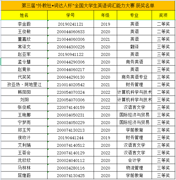 5月16日,2023年第三届“外教社•词达人杯”全国大学生英语词汇能力大赛组委会公布了本届大赛省赛(河南赛区)的获奖名单。经校级初赛选拔,冰球官网获得省赛资格的考生共有143人,其中英语专业学生39人,非英语专业学生104人。经过激烈的角逐,冰球官网英语专业组8名同学分别荣获省级二、三等奖,非英语专业组12名同学分别荣获省级二、三等奖。获奖名单如下: