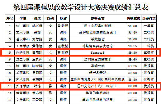 比赛过程中,各参赛教师结合自己的学科专业特色,深入挖掘课程中蕴含的思政元素,把思想政治教育有机融入到课堂教学中,实现了“知识传授”和“价值引领”的有机统一,展示了各具特色的教学设计和教学风采,得到了专家评委的一致好评。最终我院田丽玲老师在决赛中获得三等奖,钟浩老师获得优秀奖。