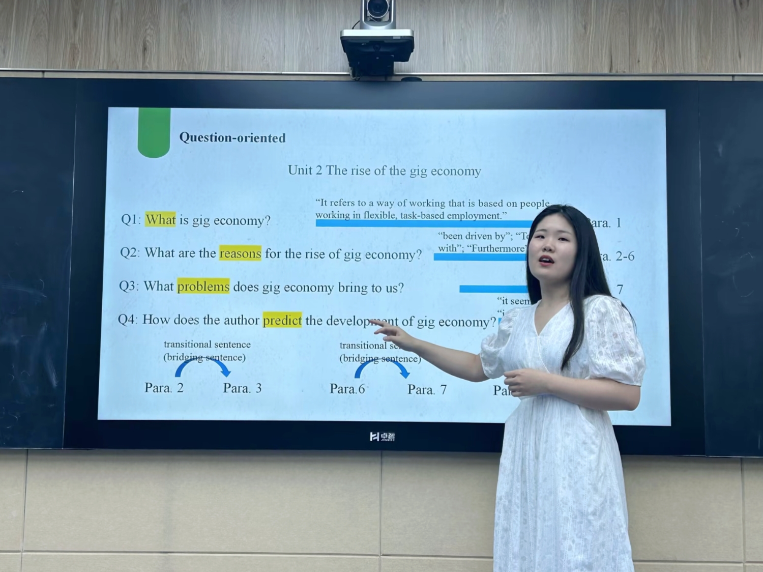 首先,22级《大学英语(文科类)》课程组郑子琨老师以《新未来大学英语综合教程2》第二单元“The rise of gig economy”和第五单元“Disappearing language”两篇文章为例,分享了探索式阅读的教学设计。针对第二单元的阅读教学,郑老师为学生分别设计了四个问题,以问题为导向帮助学生构建文章脉络,以关键词为指引,引导学生梳理文章的整体框架。在第五单元的阅读教学分享中,郑老师尝试让学生自己总结每一部分的主旨,通过填补提前给出的框架来搭建整体的文章结构,激发学生自主探索文章内容的学习动力。