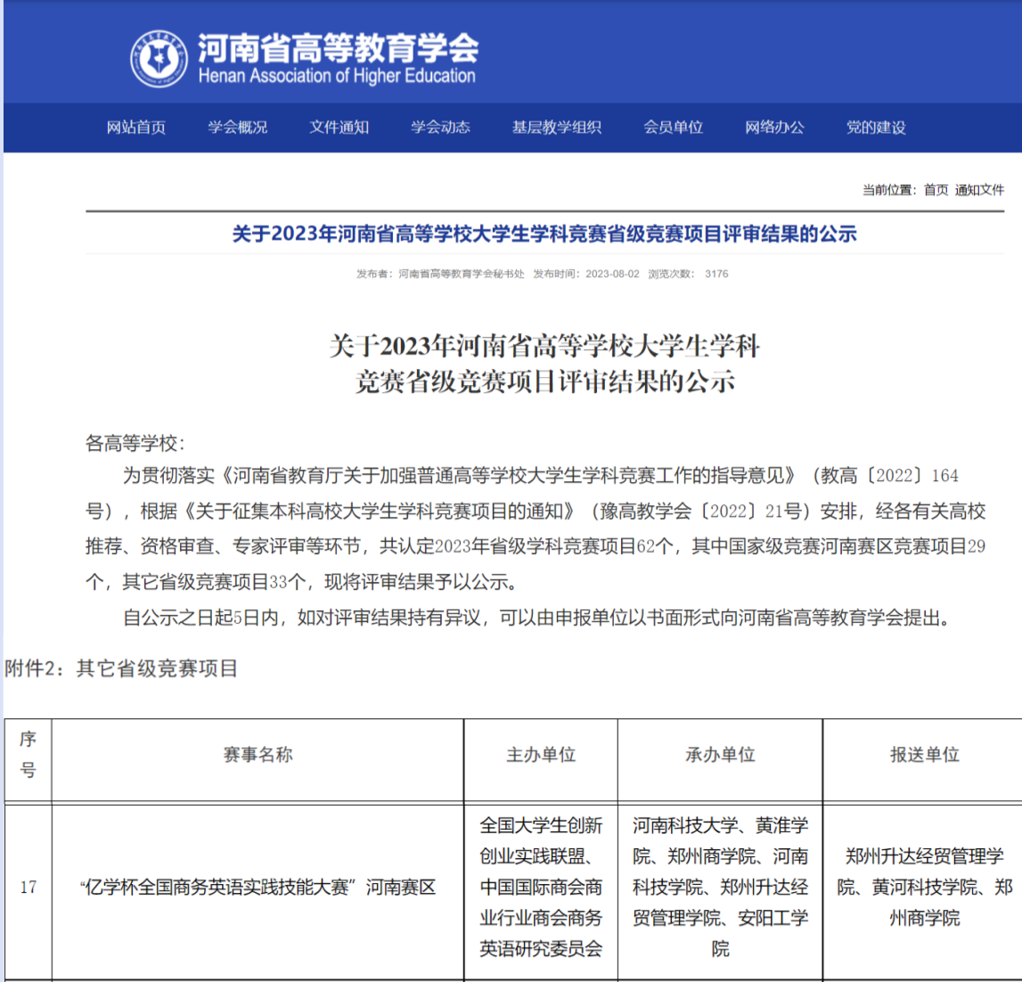 近日河南省教育厅公布了2023年河南省高等学校大学生学科竞赛省级竞赛项目评审结果,由冰球官网牵头申请的商务英语竞赛项目——“亿学杯全国商务英语实践技能大赛”河南赛比赛区顺利入选。