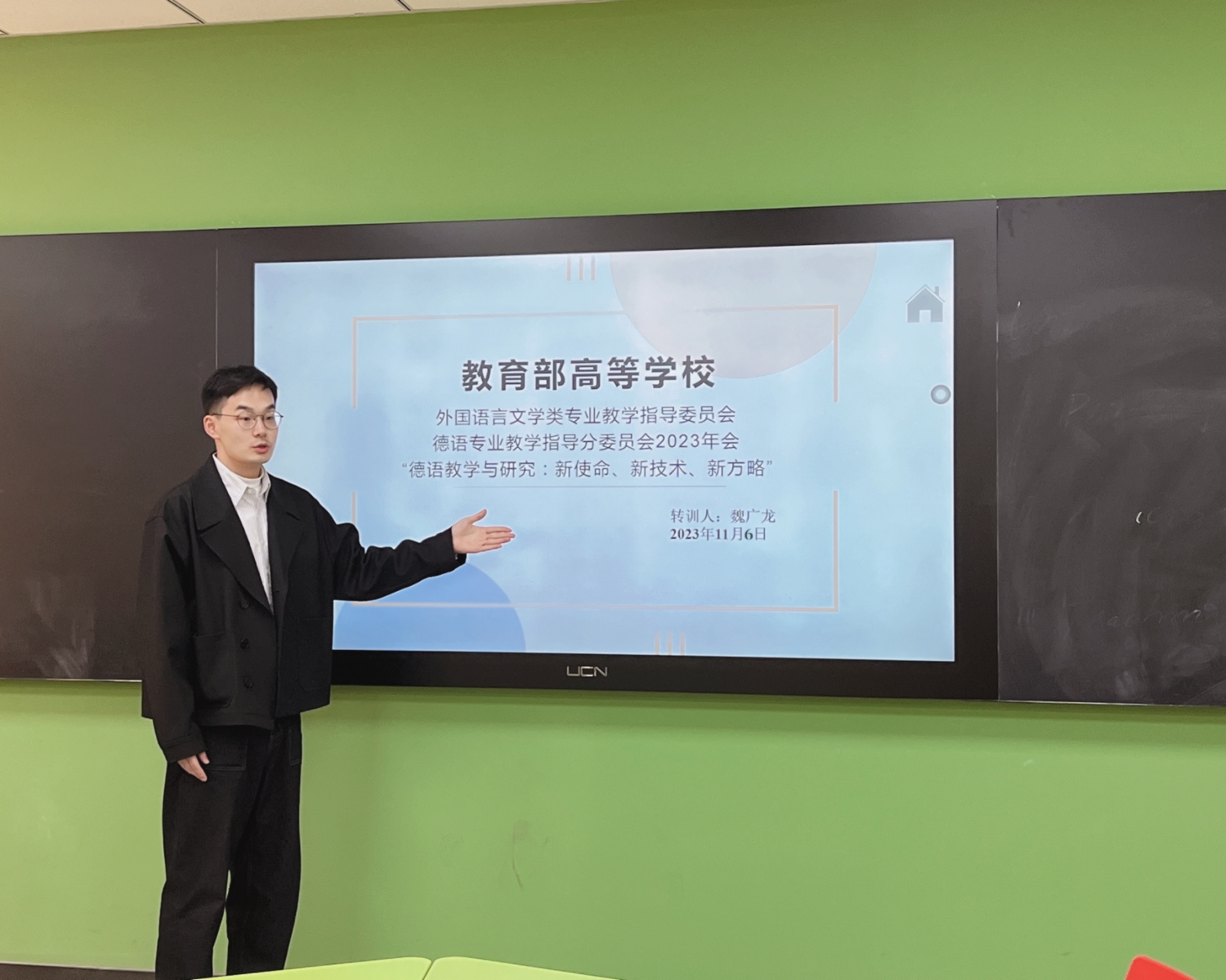 2023年11月6日下午,我院在外语楼W217开展转训汇报。本次转训由日语与德语教研室的魏广龙老师主讲,转训主题为教育部高等学校外国语言文学类专业教学指导委员会德语专业教学指导分委会2023年会“德语教学与研究:新使命、新技术、新方略”。